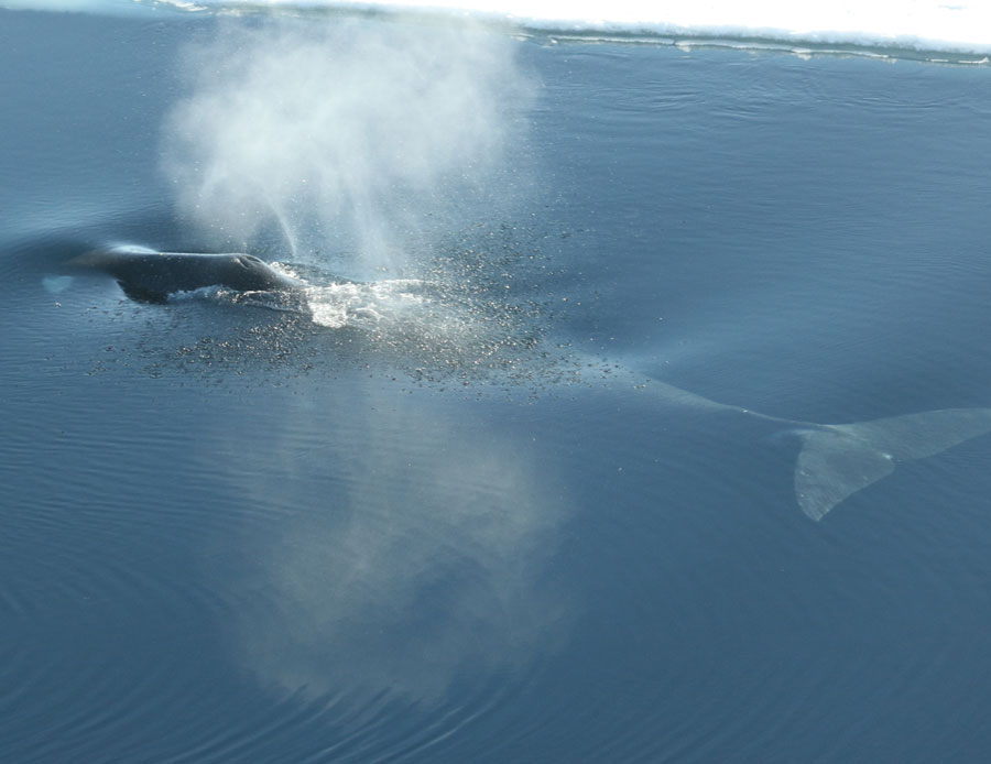 Überraschend war, die Grönlandwale tief im Packeis anzutreffen, wo sie kleine Atemlöcher zum Luftholen nutzen. In eisfreien Gebieten wurden lediglich kurze Rufe aufgezeichnet.